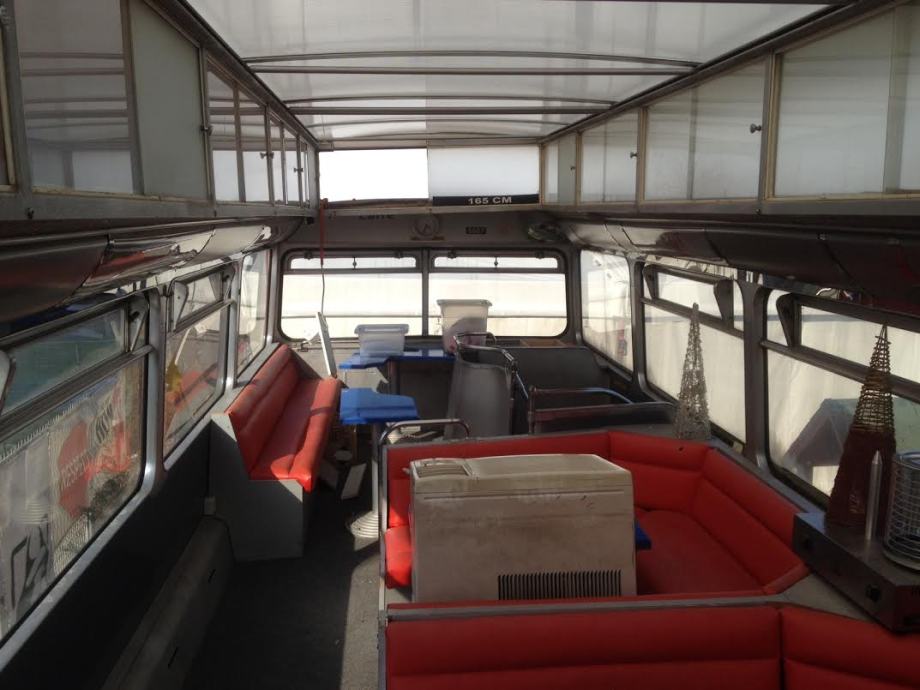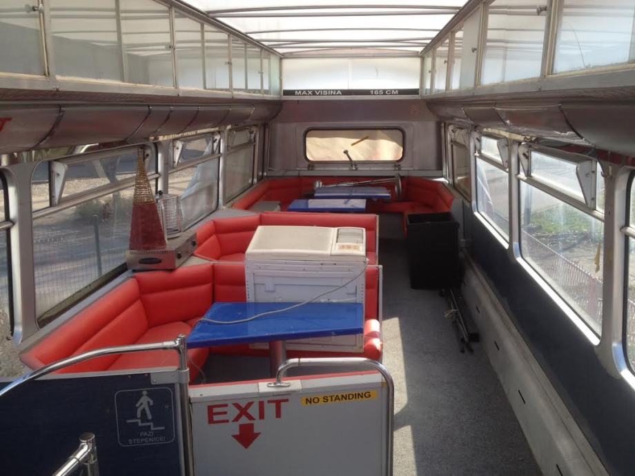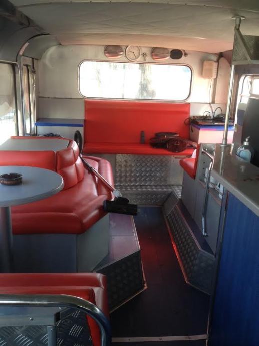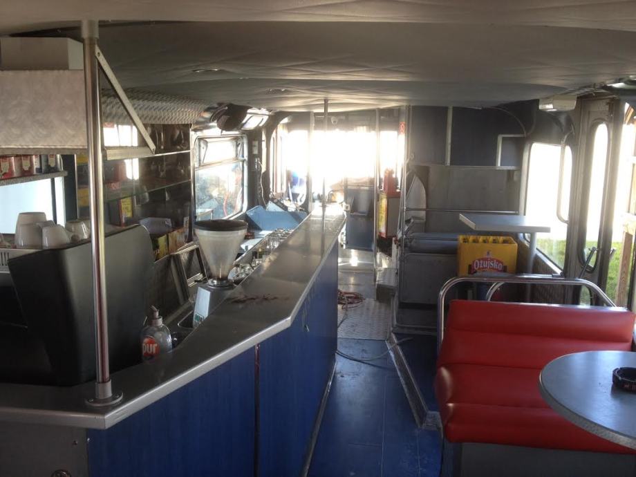 Opremljen: šankom, friziderima u šanku, klimatiziran, kompletno ozvučen...potrebno se je samo priključitii na vodu, struju i odvod. Veličina iskoristive unutrašnjosti iznosi 45m2. Nije paljen dvije godine i trenutno stoji ali po potrebi se može bez problema upaliti i biti voznan.