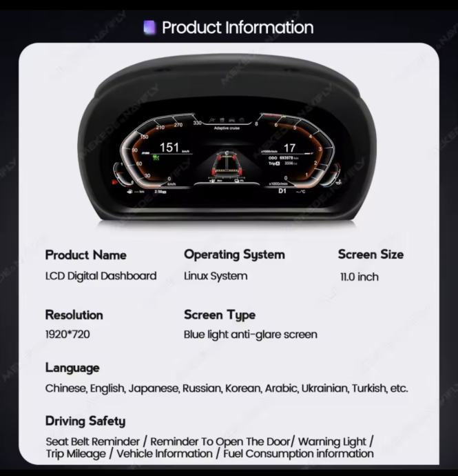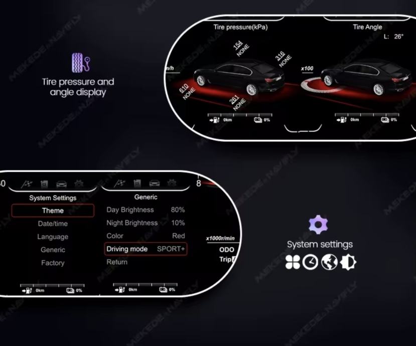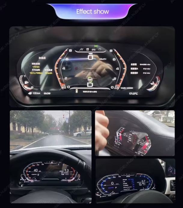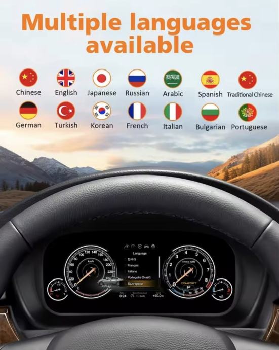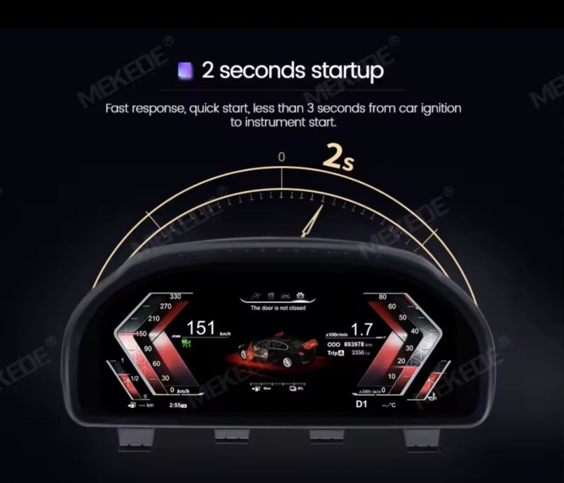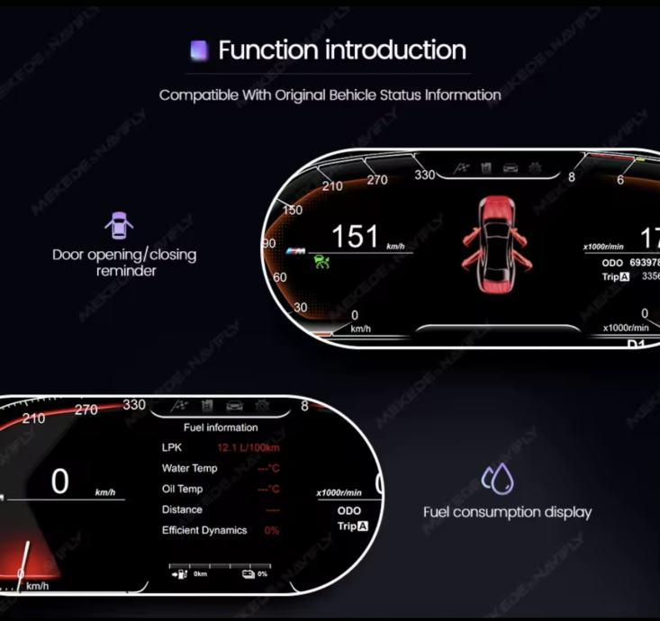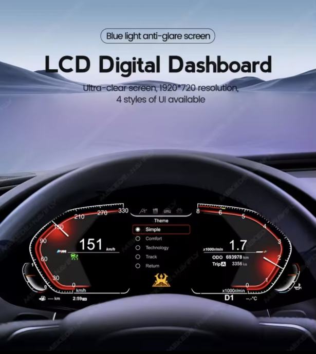 Potpuna integracija: Prikazuje sve bitne informacije – brzinu, okretaje, tlak u gumama, kut zakretanja kotača, temperaturu ulja/vode, potrošnju goriva i upozorenja (pojas, vrata, itd.).