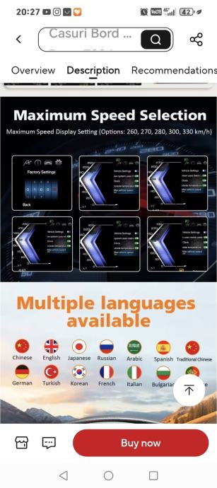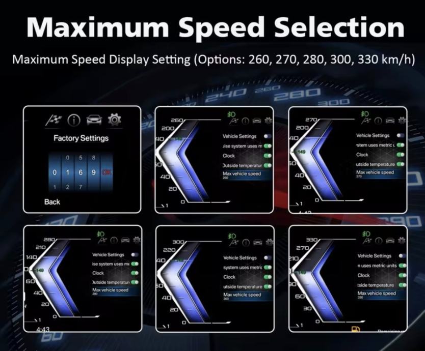 Prilagodba: Mogućnost postavljanja maksimalne brzine na prikazu (do 330 km/h) i odabir više jezika.