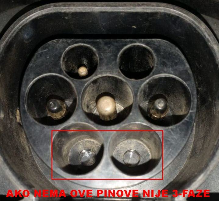 Većina automobila ima jednofazni punjač snage 7kW, a trofazni punjač 11kW je kod nekih dostupan kao opcija uz nadoplatu. Kako bi bili sigurni, provjerite svoj Type2 priključak na vozilu - ako izgleda kao na zadnjoj slici u oglasu gdje nedostaju donja dva pina, onda SIGURNO NIJE TROFAZNI.