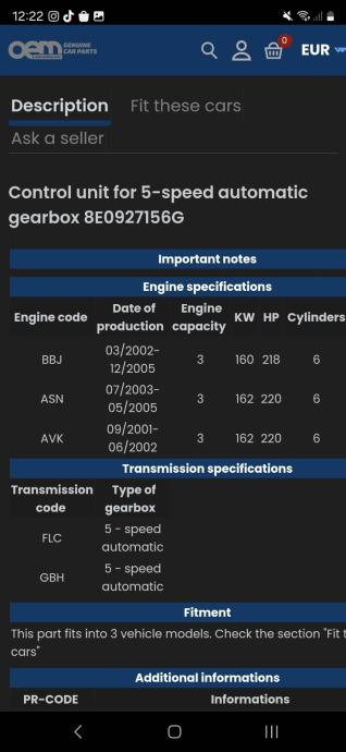 Prodajem kompjuter mjenjača od audia 3.0 v6 quattro benzinac. Oznaka je na slici.