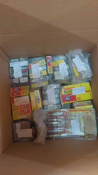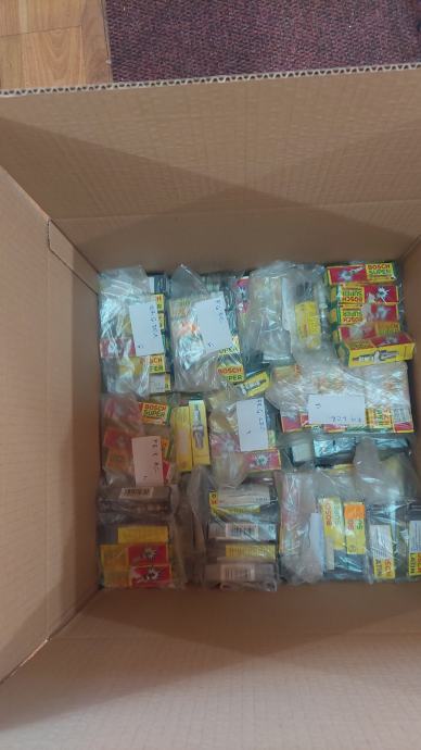 Original Bosch Super svjećice 270 komada. Svjećice su nove, nikad montirane na vozilo, stara zaliha. Kutije su uglavnom oštećene, nekoliko komada je bez kutije. Svjećice su razvrstane i upakirane po vrstama. Prodajem u kompletu.