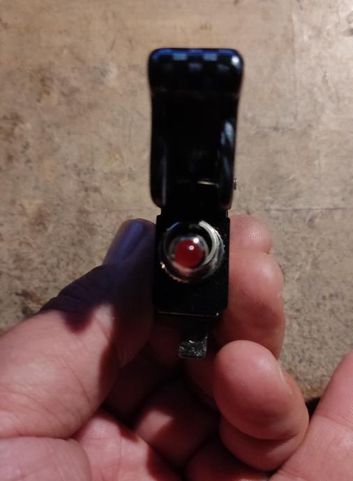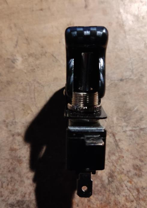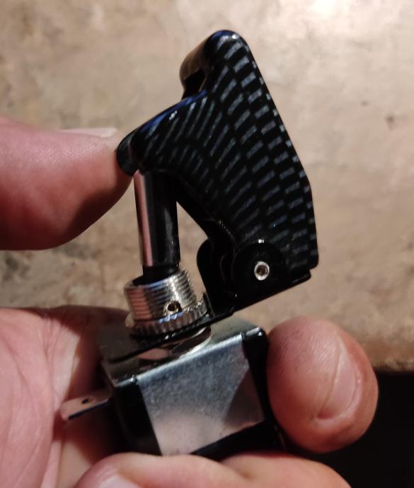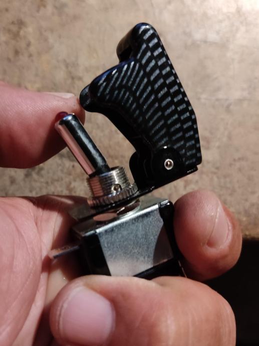 Prekidač 12V sa sigurnosnim poklopcem (avionski), Poklopac- izgled karbona.Nekorišten