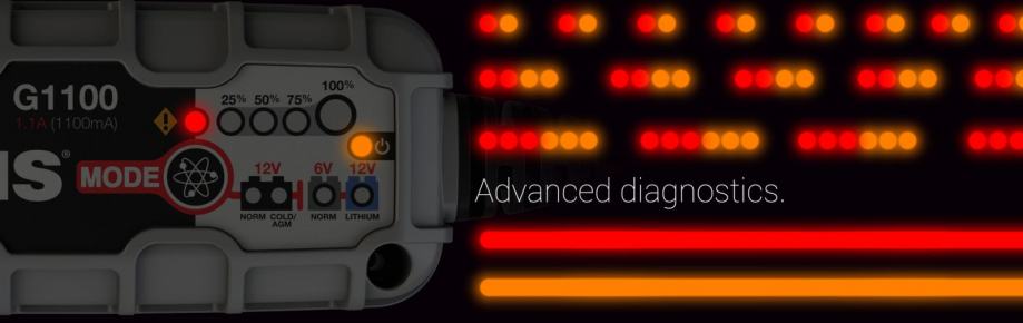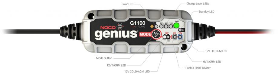 G1100 je prijenosni automatski punjač i služi za održavanje olovnih akumulatora i baterija 6V i 12V. Dizajniran za punjenje motocikla, ATV,vodenih motora,snježnih motora, osobnih plovila, traktorskih kosilica i još mnogo toga. Također se koristiti za održavanje