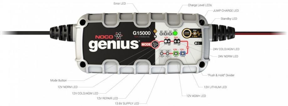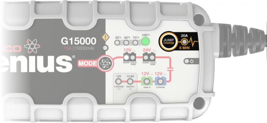 G15000 je prijenosni automatski punjač i služi za održavanje olovnih akumulatora i baterija 12V i 24V. Dizajniran za punjenje motocikla, ATV,vodenih motora,snježnih motora, osobnih plovila, traktorskih kosilica i još mnogo toga. Također se koristiti za održavanje