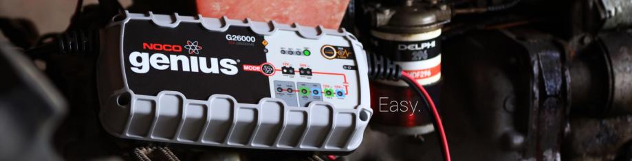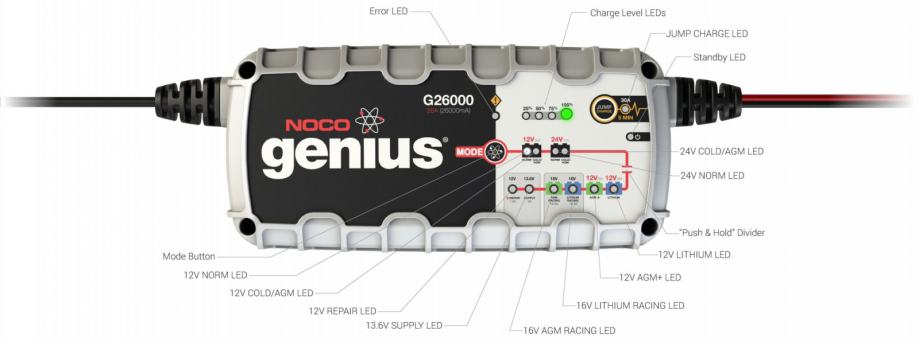 G26000 je prijenosni automatski punjač baterija te i održava 12V i 24V olovne i litij-ionske baterije. Dizajniran za punjenje automobila, plovila, RV, SUV-a ili dizel kamiona, kao i trkaćih vozila. Prati aktivnost baterije za sigurno i učinkovito punjenje bez prekomjernog prepunjavaja napona,s ugrađenim desulfatom za baterije.Izvrstan za pomlađivanje slabih i sulfatiziranih baterija. Dolazi opremljen integriranim modom za pokretanje motora JumpCharge za pokretanje mrtvih baterija.