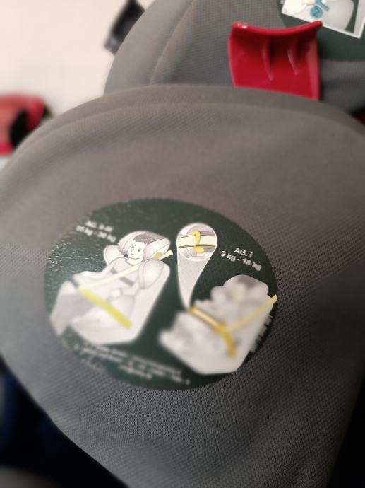 Na autosjedalici su crvenom bojom označeni dijelovi kroz koje mora proći sigurnosni pojas. Tako se jednostavnije veže autosjedalica i manji je rizik od pogrešne uporabe.