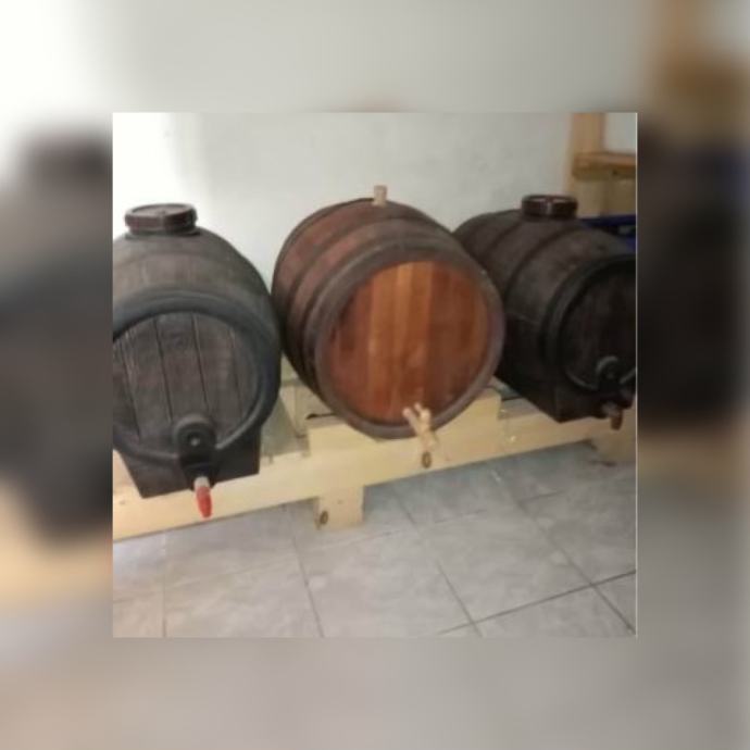 U sredini je drvena bačva a lijevo i desno su plastične bačve plus drveni stalak.