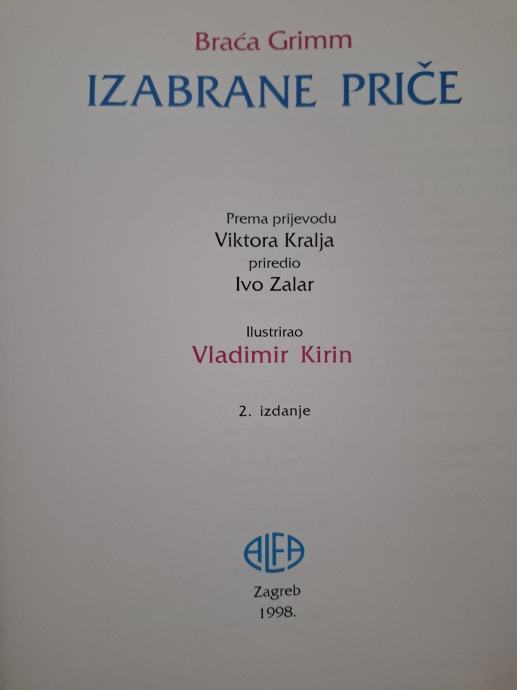 Braća Grimm - Izabrane bajke - ilustrirao Vladimir Kirin, izdavač Alfa Zagreb, 1998. godine, 18,5 x 21,5 cm, tvrdi uvez, 47 stranica.