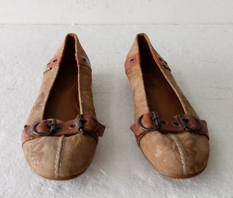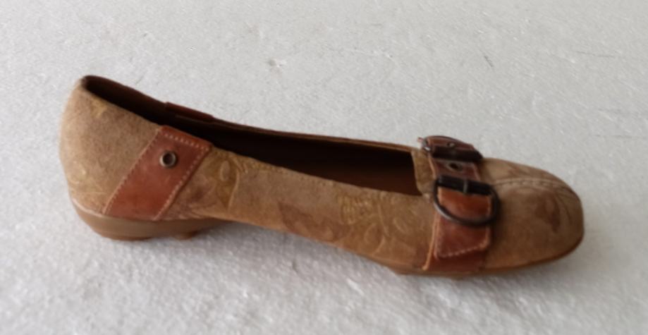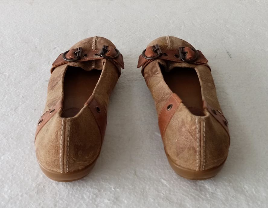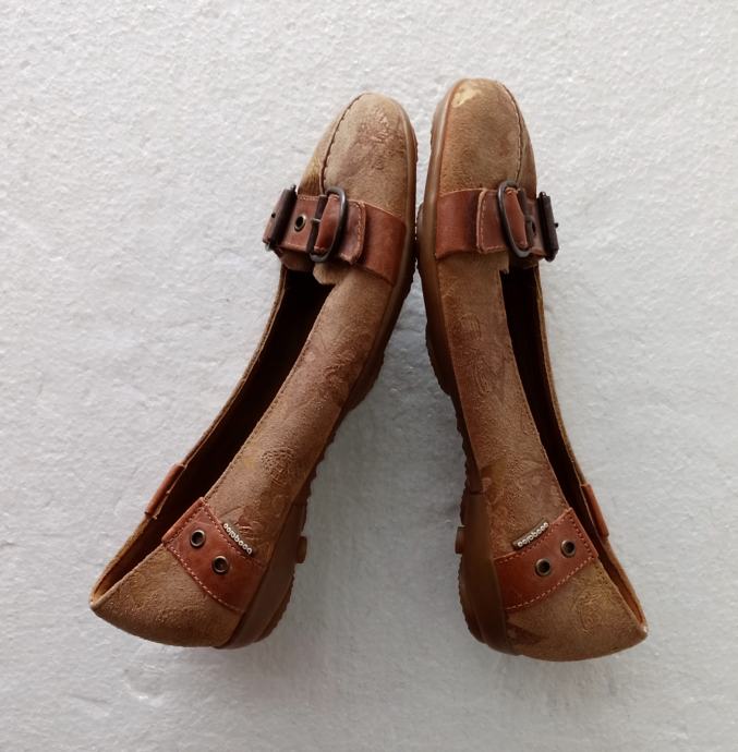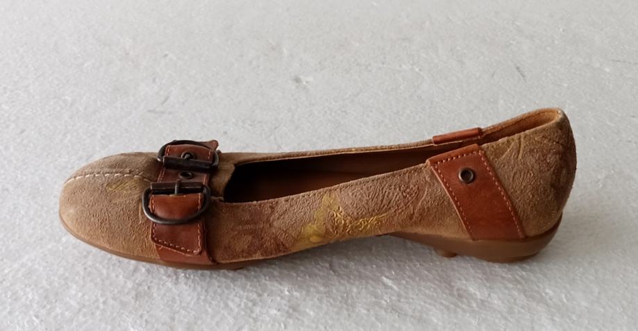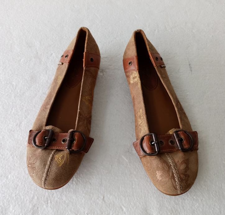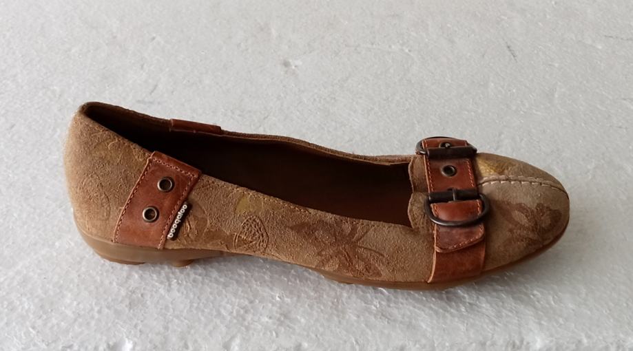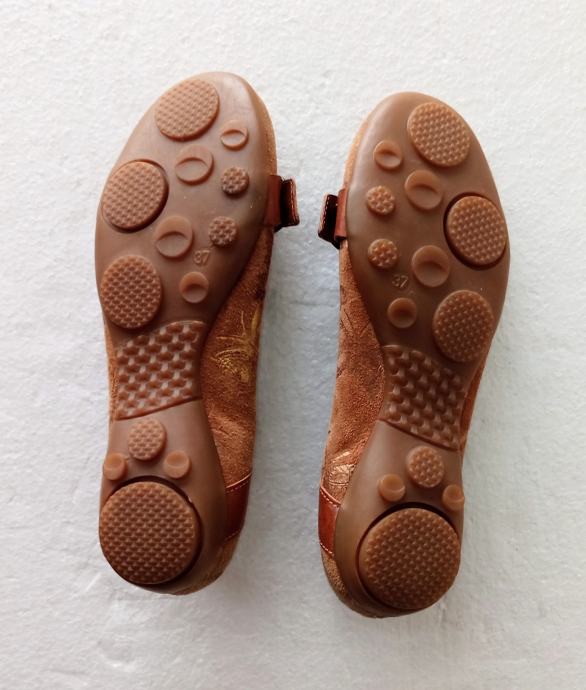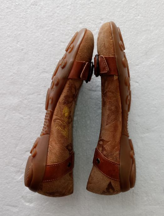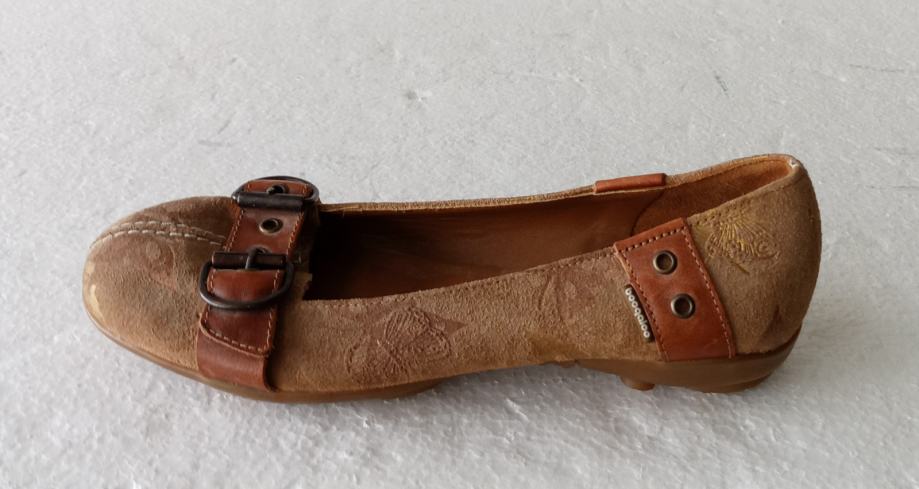 BOOGALOO balerinke deklarirane veličine 37 (unutrašnje gazište 24,5 cm). Gornjište od prirodne (prešane) kože, sa utisnutim leptirima. Ima i ukrasni remen. Iznutra također prirodna koža. Džonovi su protuklizni.