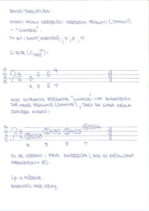 Tablaturu čine četiri vododarvne linije, jedna ispod druge i nekakvi brojevi razbacani po njima. Linije predstavljaju žice od bass gitare (E, A, D, G), a brojevi redni broj praga na vratu bassa kojeg treba stisnuti i odsvirati. Ova tablatura je moj autorski rad, jedinstvena je i ne može se nigdje nabaviti. Sastoji se od dva djela. Prvi je ''forumula'' za sviranje svake od sljedećih skala: dur, mol, dominant i mol B5. Drugi je razrađen cijeli kvintni krug. Oboje Vam omogućava neprekidno sviranje satima, a bez ponavljanja već odsviranog.