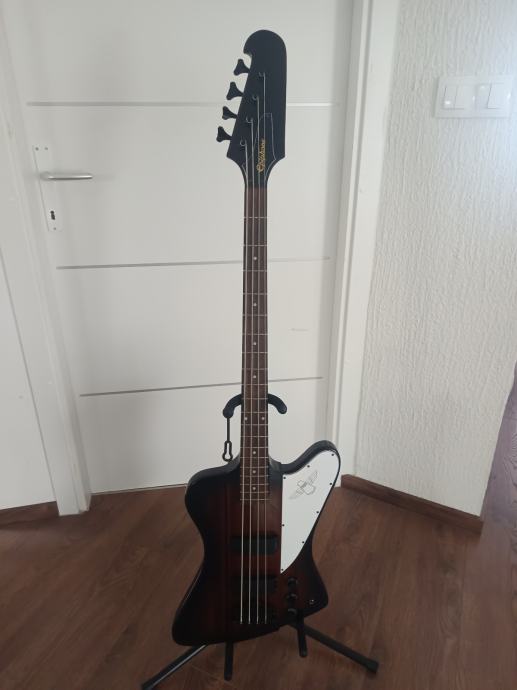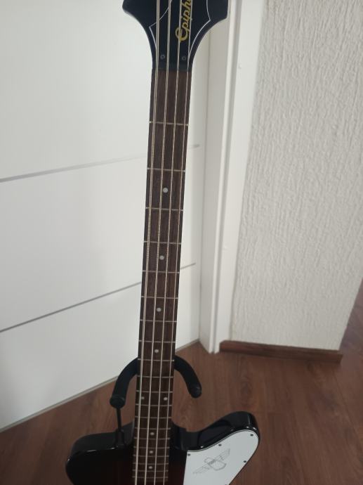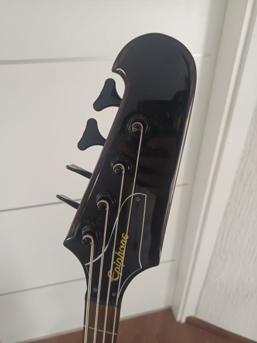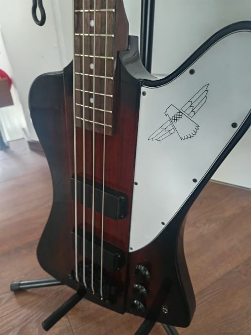 Epiphone Thunderbird IV bas gitara. Kupljena preko 1.5 godinu sa Thomanna. Nove žice stavljene ovaj tjedan. Bas svira super.