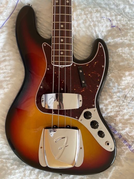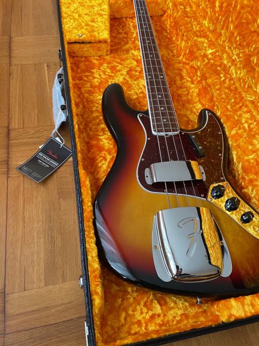 BEZ ZAMJENA! Bass je kao nov, nema ostecenja osim male udubine od nokta kod bridge pickupa. Dolazi sa originalnim koferom. Kofer na sebi jos ima etikete. Nitro finish u pravoj 3 tone sunburst boji, 1966 Reissue Fender pickupi, binding, “lolipop” tuneri kao na 1966 modelima.