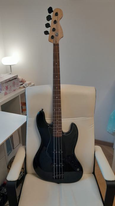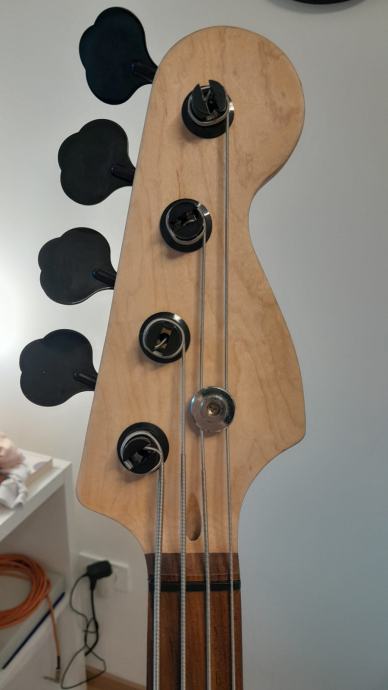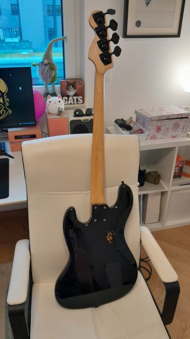 Bok, prodajem ovaj zbilja jedinstven bass koji je život počeo kao napušteni Squier u jednoj garaži. Nekako mi ga je bilo žao pa sam ga odnio doma, nakon šta sam skužio da je vrat fantastičan i da je sam bass rezonantno odličan jer se radi o drvu koje je staro minimalno 24 godine. Možda starije ne znam. U svakom slučaju instrument koji sam odnio doma s namjerom da stoji doma samo za vježbu i da ne moram vozit vamo tamo u autu izmedju proba počeo sam lagano modificirati naručujući s Thomanna dijelove jer sam htio full black izgled. Na kraju sam sve poskidao i promijenio kompletan hardver i potove. Uz bass prodajem i original Fender gig bag za 30 eura. Prilažem popis upgradea. P.S. ogrebotina je od bulletbelta jer su bass svirali na EXIT festivalu poznati domaći metalci ;)