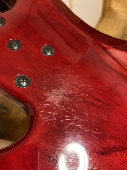 Gitara ima nekoliko ogrebotina na glavi in skoro nevidan "buckle rash", te prirodnu anomaliju u drvu na vratu (gledaj fotografije).