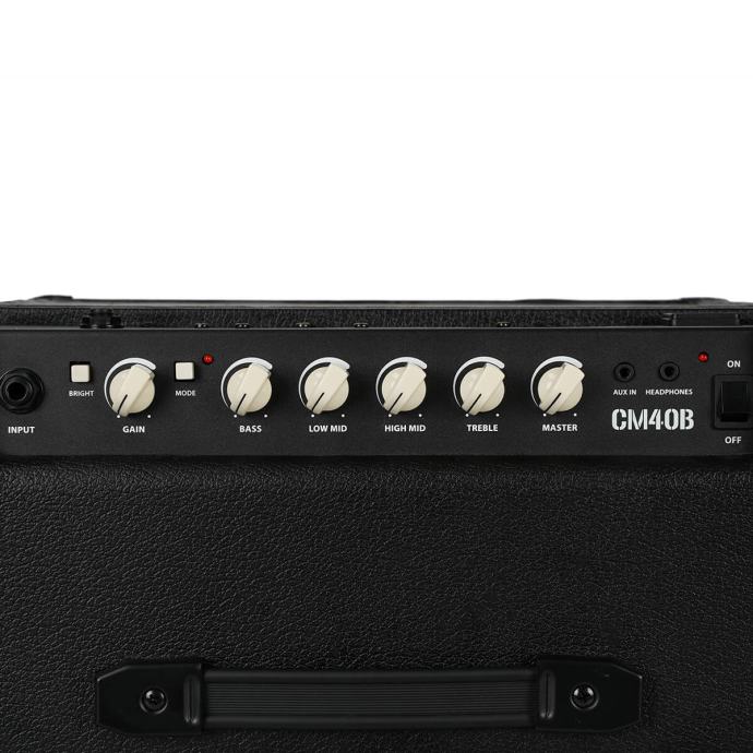 The CM40B features two controls for the all-critical midrange: Low Mid and High Mid. This allows for the player to fine-tune the mids to best suit the type of instrument to his/her liking and expand the tonal range of the amplifier. In conjunction with the Treble and Bass controls, the two Mid controls will provide a wide range of sounds suitable for virtually any playing style and musical genre.