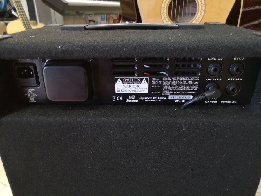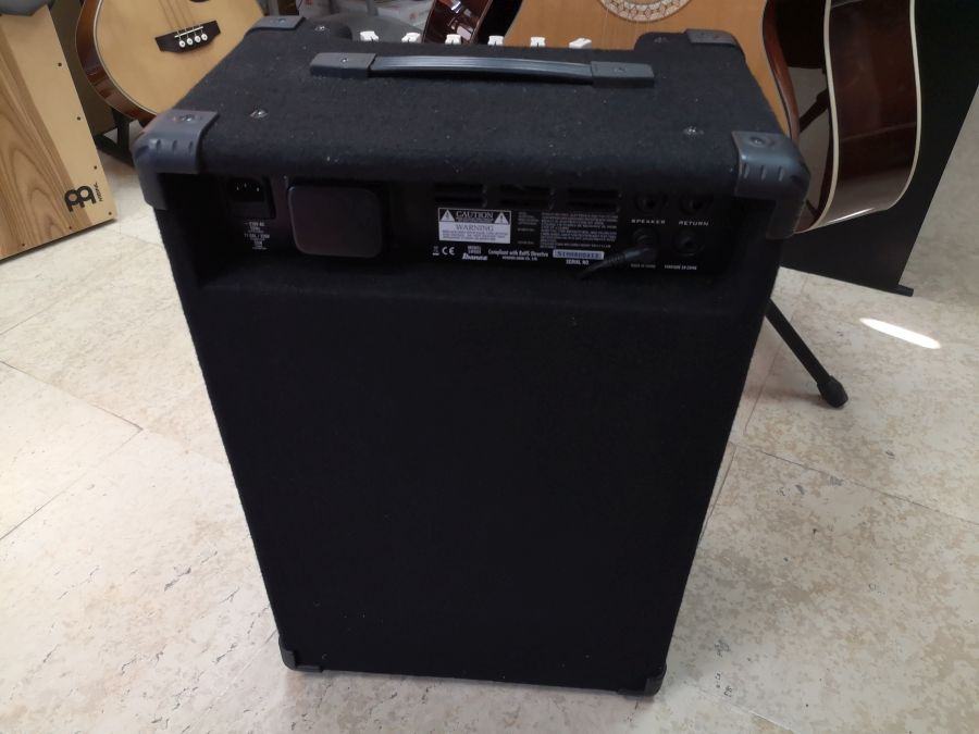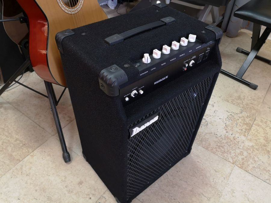 bas pojačalo, snage 65 watt, s 12" zvučnikom i hornom, ugrađenim kompresorom, aktivnim 3-band ekvilajzerom, HUE kontrolom boje zvuka, BRIGHT prekidačem za pojačavanje visokih frekvencija, SHAPE prekidačem za instatno skidanje srednjih frekvencija, TWEETER ON / OFF prekidač za kontrolu horne, metalnom ručicom sa donje kojom se pojačalo može postaviti u kosi položaj. Izvrsno očuvano, doslovno kao novo.