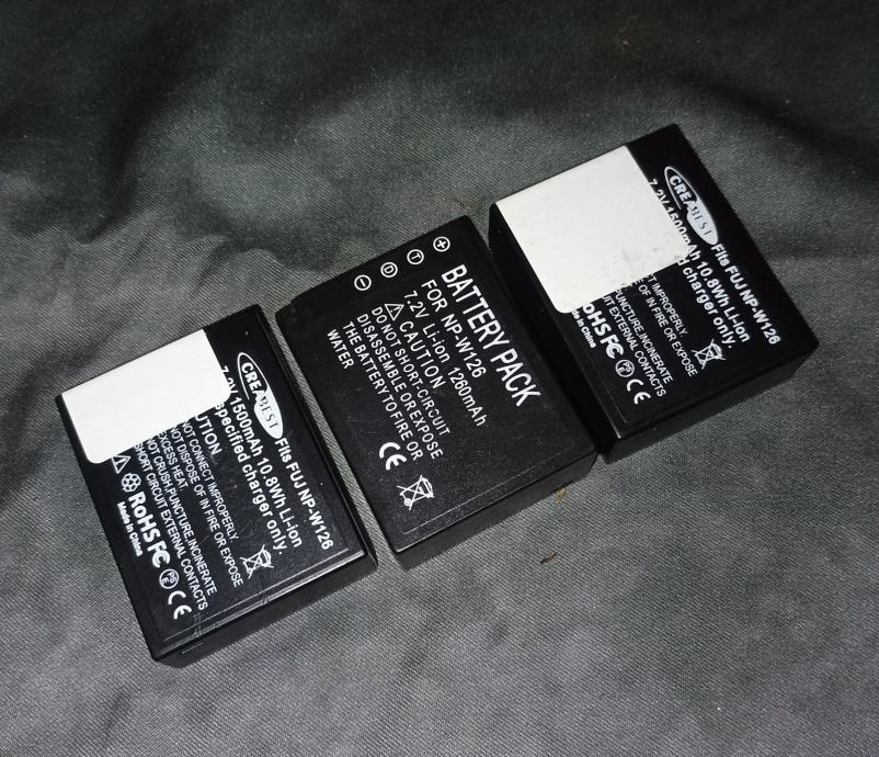 Prodajem tri zamjenske baterije za Fujifilm fotoaparate, kompatibilne s modelom NP-W126. Radi se o litij-ionskim baterijama kapaciteta 1260 mAh, napravljenim kao zamjena za originalne Fujifilm baterije.