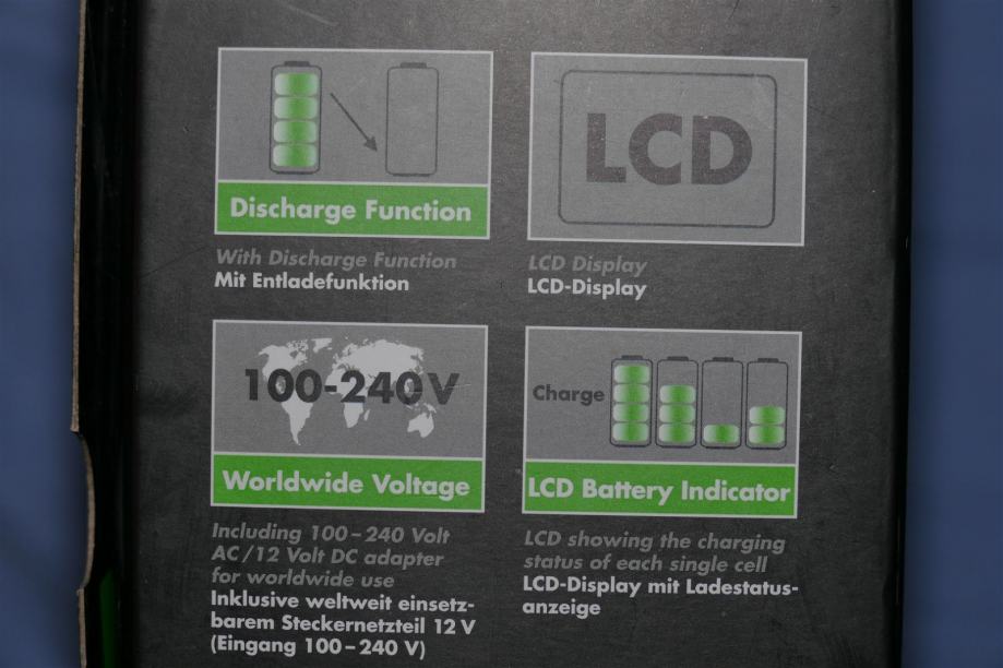 LCD zaslon prikazuje stanje punjenja za svaku bateriju pojedinačno. Adapter sa četiri različita nastavka za utičnice 100 - 240 V i adapter za 12 V omogućavaju punjenje baterija i u automobilu ili tijekom putovanja u inozemstvo. Sadrži niz sigurnosnih funkcija kako bi punjenjenje bilo što jednostavnije.
