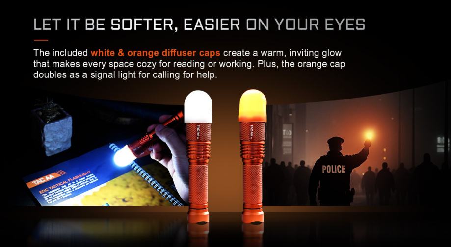 • The included diffuser caps (white, orange) can transform your light into a reading, signal or emergency light.