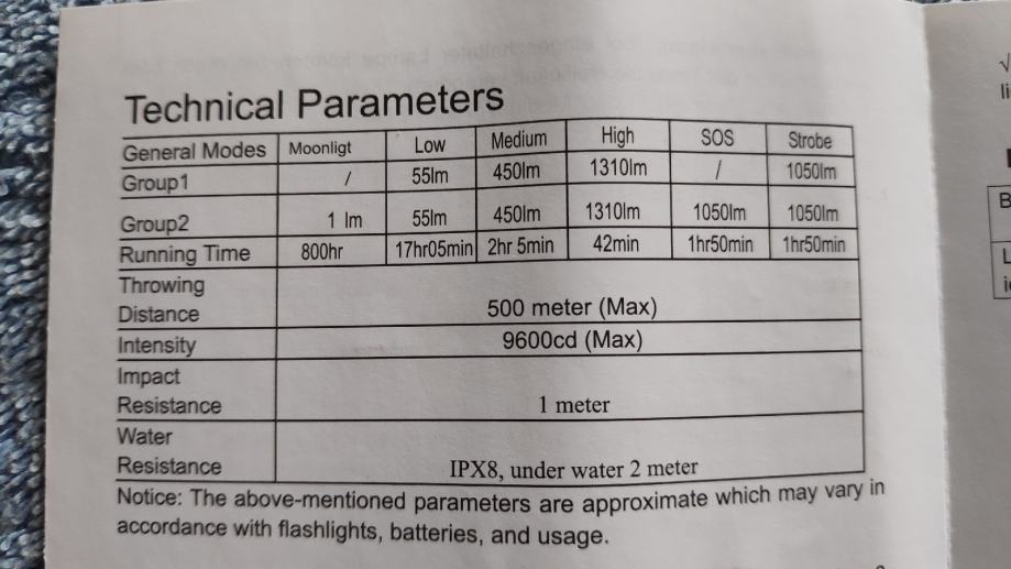 Skupina 2: Mjesečina (1 lm) -niska (55 lm) -srednja (450 lm) -visoka (1310 lm); SOS (1050 lm); stroboskop (1050 lm)