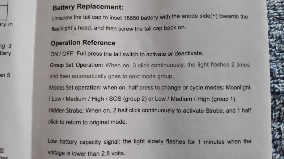Postavljanje načina rada: kada je uključeno, pritisnite napola za promjenu ili ciklus načina rada: Mjesečina / nisko / srednje / visoko / SOS (skupina 2) ili nisko / srednje / visoko (skupina 1).