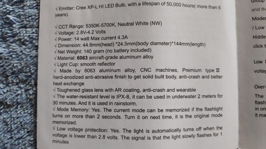 Zaštita od niskog napona: Da. Svjetlo se automatski isključuje kad je napon niži od 2,8 volta. Signal je da svjetlost polako treperi 1 minutu