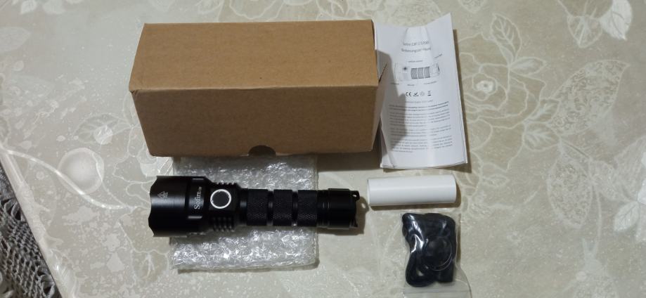 Kvalitetna lampa Sofirn C8F model ( ovo F je bitno) sa tri jake Cree XPL diode,originalnim 21700 baterijskim uloškom ,adapter za 18650 baterijske uloske ( moze raditi i na jedan 18650 ulozak uz nesto slabije karakteristike) ,uzica za nosenje ,rezervni O ringovi i uputstva
