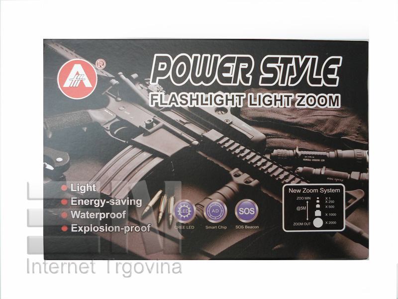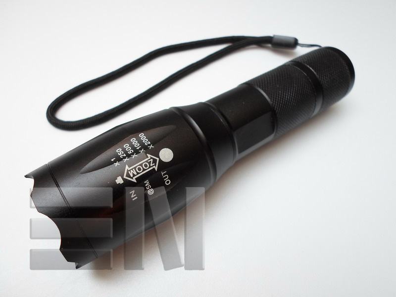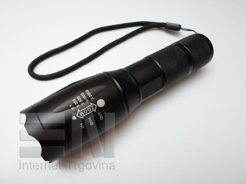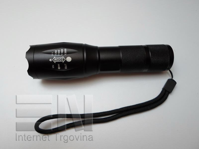 LED svjetiljka , visokih svjetlosnih performansi, sa Cree LED T6 diodom, vodootporno aluminijsko kučište ( nije za ronjenje) , mogučnost zumiranja u uži i širi snop svijetla.