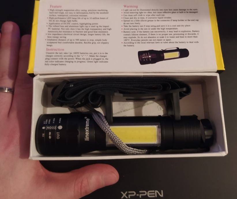 Puni se preko mikro-USB kabela, varijabilna jacina, zoom, ima dvije vrste svijetla, na daljinu, i na sirinu. Uz nju ide i dodatak sa kojim ju se moze staviti na glavu i koristiti na taj nacin.
