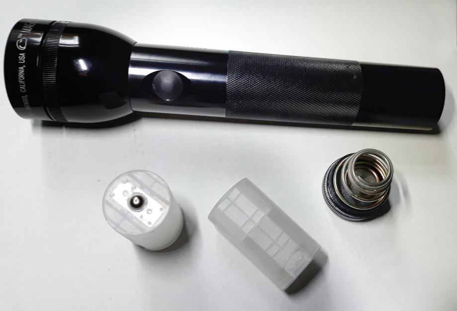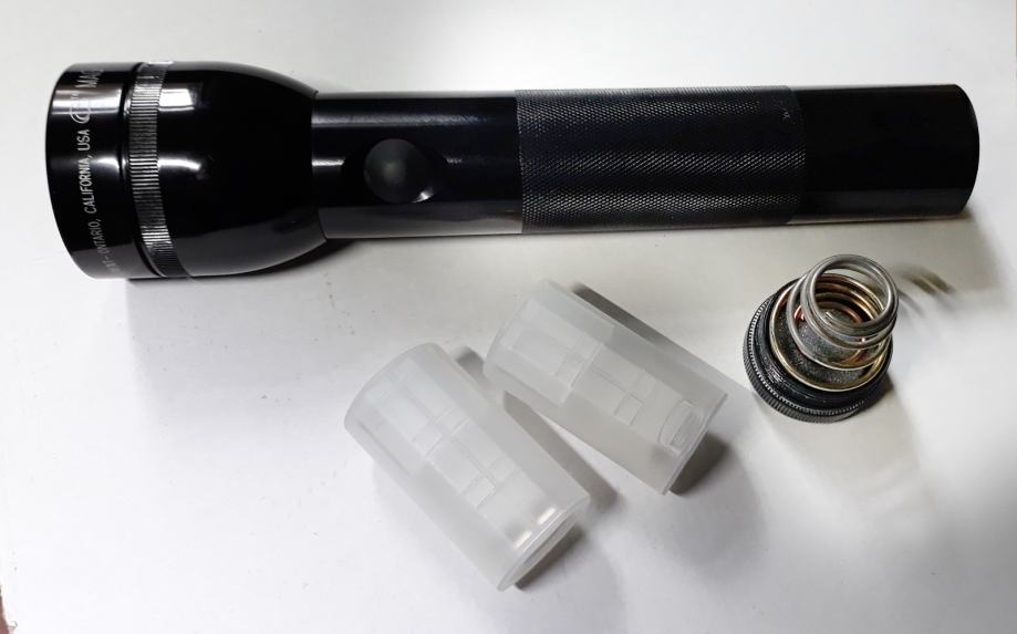 Mag-Lite baterija,praktički nova sa Led žaruljicom. .Baterijski ulošci 2x D,kao i adapterski ulošci 2x, koji prihvaćaju baterije 1,5 V AA -4 kom.kao zamjena za baterije tip D.