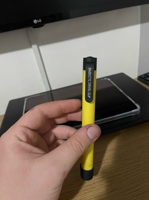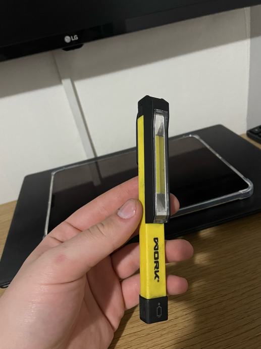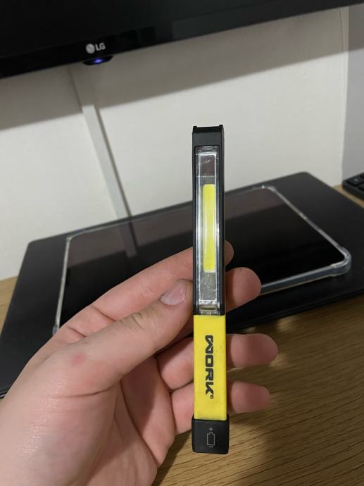 Baterijska svijetiljka izrazito jaka za svoju veličinu, radi na baterije. Može se na dva mesta zakačiti uz pomoć magneta, meni višak jer imam druge svijetiljke. Cijena 8€.