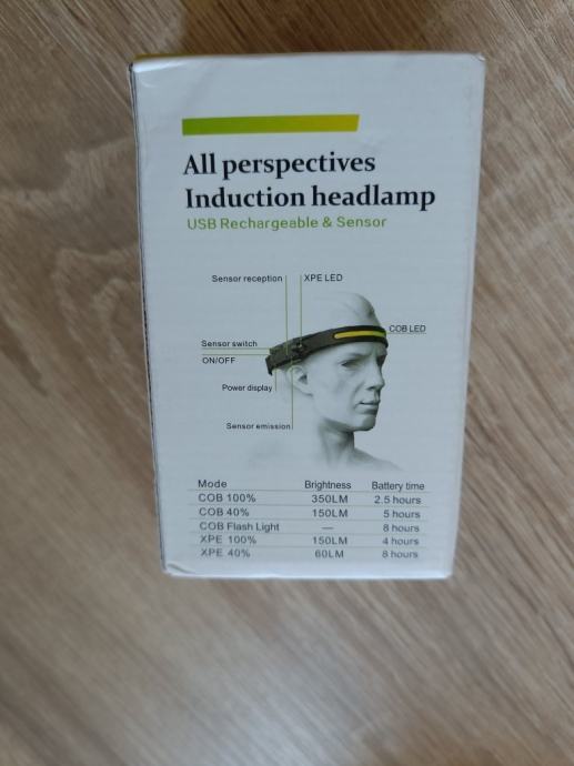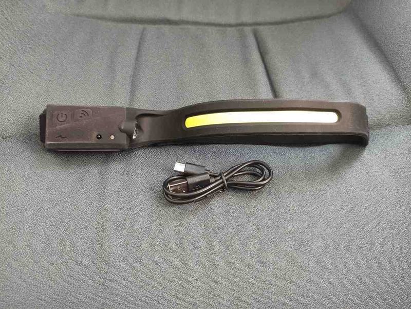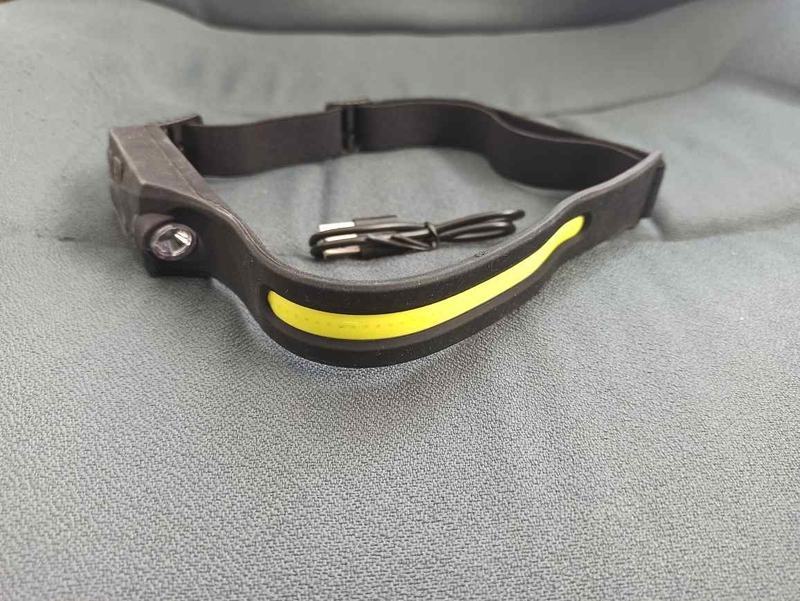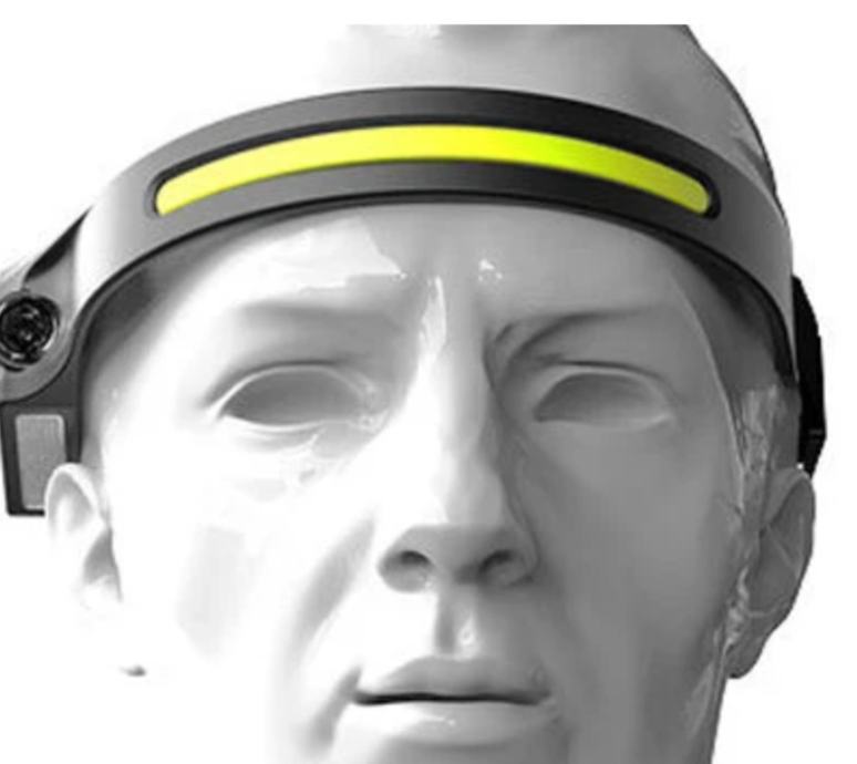 Naglavna lampa sa COB LED trakom i dodatnim LED reflektorom. Jako lagana, jako svjetlo (podesivo u 5 stupnjeva), paljenje na gumb ili na prolaz rukom pokraj senzora, vodootporna, flaksibilna. Gumena traka s prednje strane, podesiva elastična traka sa stražnje strane. Može se nositi na glavi ali i oko tijela.