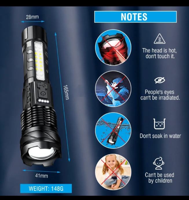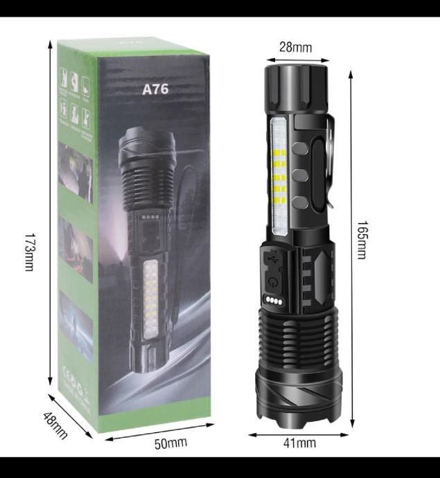 Po dimenzijama, 169x41x30 mm, ova Led-Laser ručna svjetiljka spada u kategoriju srednje velikih, pa je vrlo zahvalna za nošenje i rukovanje !