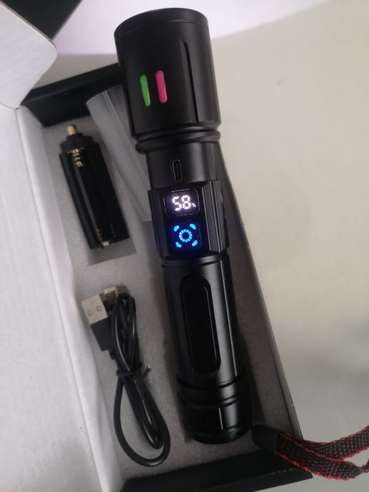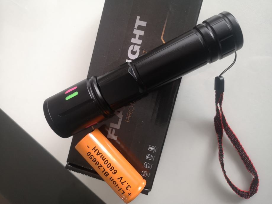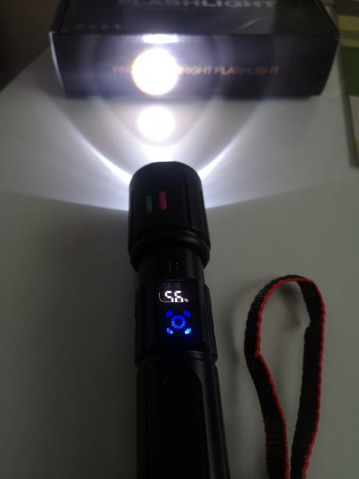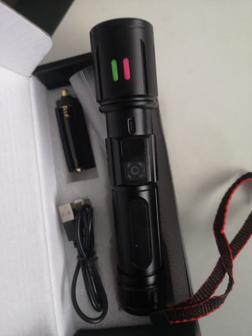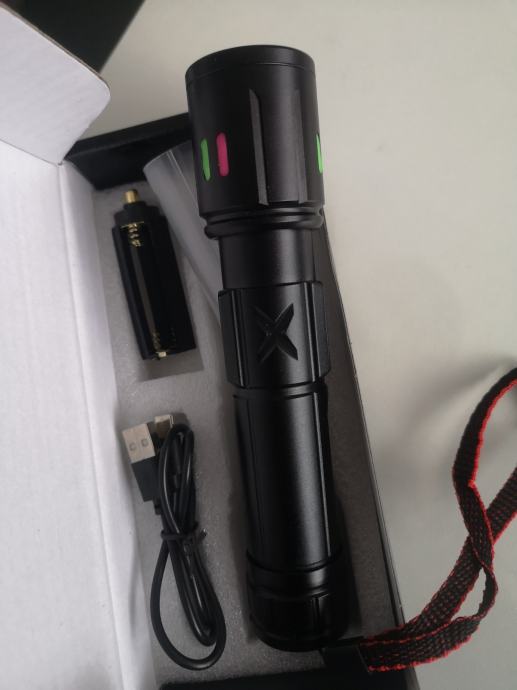 Izuzetno moćna svjetiljka načinjena od aluminijske legure domet snopa svijetlosti do 500m.Svjetiljka puni se putem USB-a i posjeduje pokazivač kapaciteta napunjenosti uloška. Snop svjetla baca u točku ne u kvadratu, u kompletu ide, lampa uložak i žnjora za punjene.