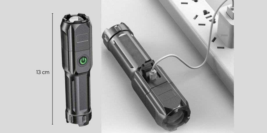 Ručna lampa s teleskopskim fokusiranjem, emitira izuzetno jako LED svjetlo, 3 načina osvjetljenja: jako ili srednje jako svjetlo i SOS treperenje, puni se priloženim USB kabelom, upravljanje s jednim gumbom, laka i praktična za nošenje, otporna na udarce, mat površina je ugodna za držanje, izvrsno za aktivnosti na otvorenom kao što su kampiranje, lov, hodanje, penjanje, planinarenje, ribolov, savršena alatka za sve koji su istraživači prirode ili adrenalinski entuzijasti, i u mehaničkoj radionici, lampa će Vam jako dobro doći,