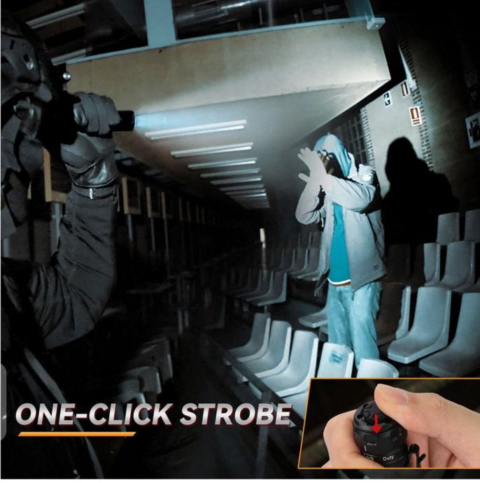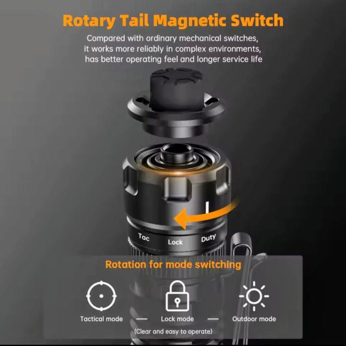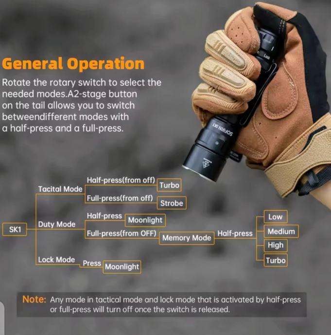 Inteligentni dvostupanjski stražnji prekidač SK1 nudi besprijekornu kontrolu u svim načinima rada, osiguravajući brzo i intuitivno rukovanje samo jednom rukom. U načinu rada (Dežurstva), pola pritiska aktivira način rada (Moonlight Mode), dok puni pritisak uključuje stalnu svjetlinu (Constant Brightness). Nakon toga, dodatni polupritisci mogu bez napora mijenjati između niskog/srednjeg/visokog/turbo načina rada. U Taktičkom načinu rada, pola pritiska trenutno aktivira Turbo način rada, a puni pritisak uključuje Strobe način rada za hitne slučajeve ili samoobranu.