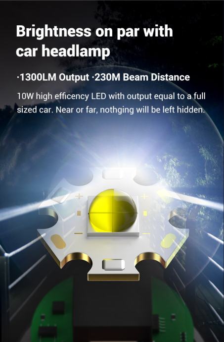 - Visokoučinkovita LED dioda od 10 W s izlazom koji je jednak automobilu pune veličine.