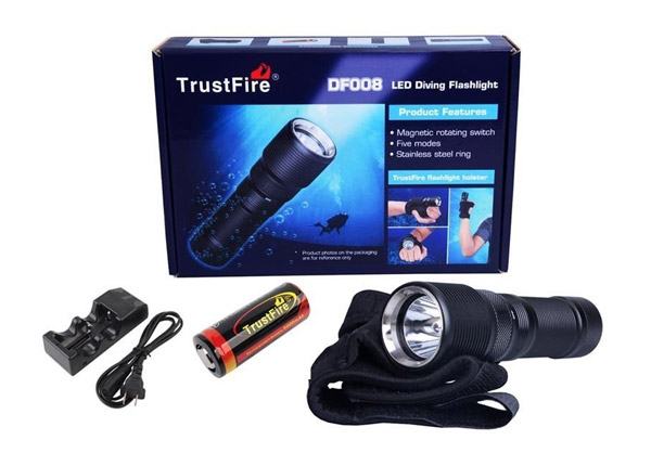 Trustfire DF008 ronilačka svjetiljka sa Cree XM-L2 čipom daje maksimalnu jačinu snopa od 700 lumena. Vodootporna je do dubine od 50 m, paljenje i gašenje je pomoću magnetnog, rotacijskog prekidača. U kompletu se uz samu svjetiljku isporučuju : futrola za nošenje oko ruke, 1 x 26650 Trustfire punjiva Li-Ion baterija sa PCB zaštitom i punjač za bateriju.