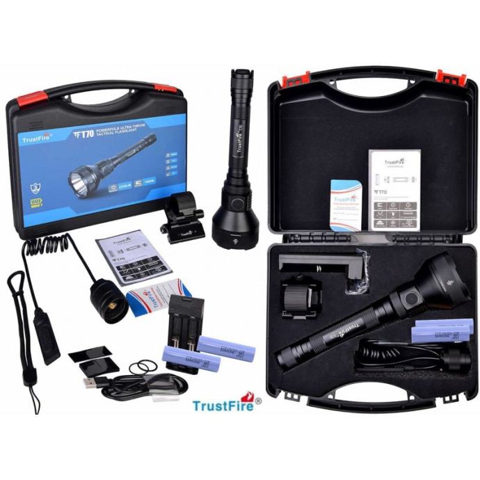 TrustFire T70 je bateriska svjetiljka s dometom od 1000M. Napaja je 2*18650 baterije s 4 razine svjetline, dizajna je s velikim reflektorom, bočnim prekidačem za promjenu svjetline, vodootporna (IPX8) , test pada od 2 metra.