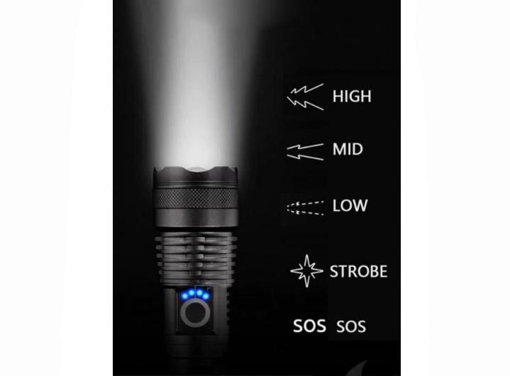 LED svjetiljka visokih svjetlosnih performansi, sa Cree XHP50 diodom, glavom i lećom dalekog dometa, teleskopski zoom, fokus snopa se mijenja pomicanjem glave svjetiljke. Leća za fokusiranje omogućuje promjenu kuta raspršivanja svjetlosti iz širokog mjesta u uski snop..
