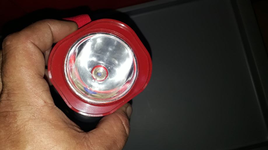 Velika baterijska svetiljka cijev s boka,s prednje strane leća,na 6 D baterija. Traka za nošenje ili fiksiranje,u odličnom stanju malo ili nimalo rabljena. Made in Hong Kong.šaljem hp,tisak.