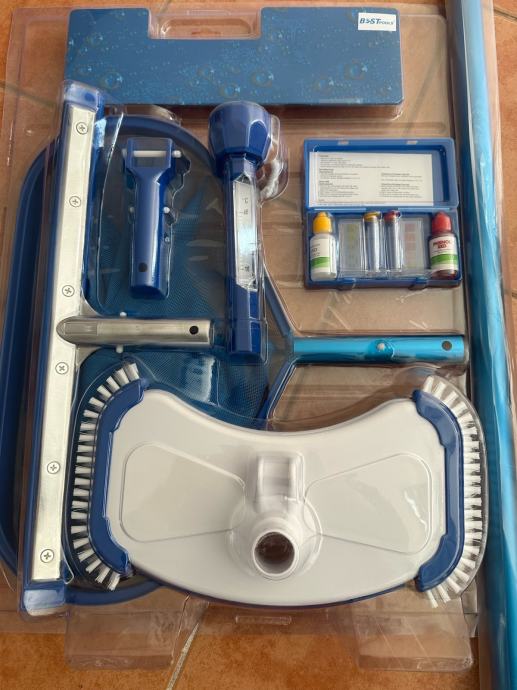 Set sadrži Kapi za testiranje bazena,termometar za mjerenje temperature,četka za usisavac ,četka za čiscenje i teleskopski štapa