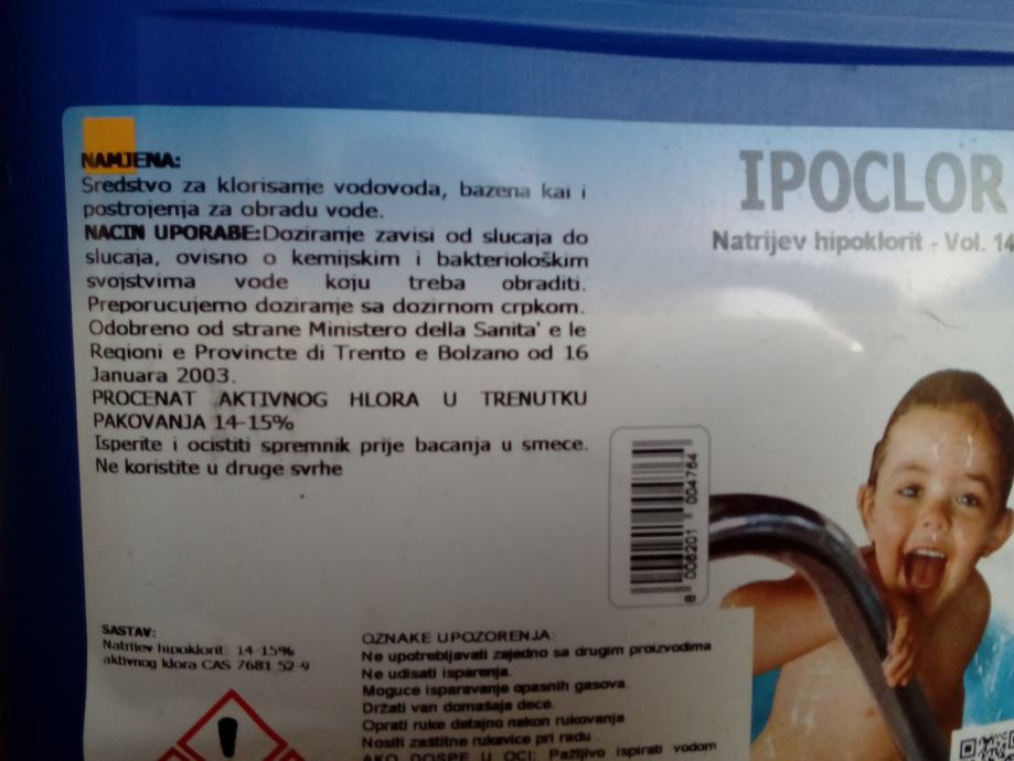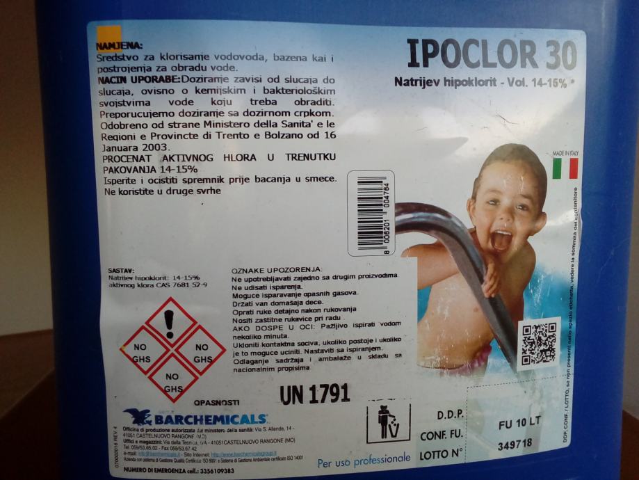 Original kanister 10 litara IPOCLOR, natrijev hipoklorit, proizvođač Barchemicals, sredstvo za dezinfekciju vode. 14-15% aktivnog klora...