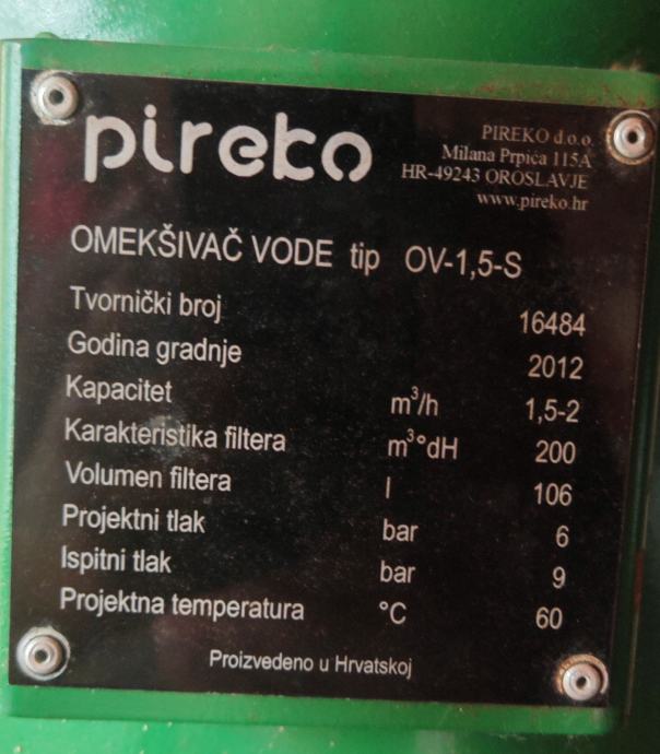 Prodaje se ionski omekšivač vode s ručnim upravljanjem, s jednim ionskim filterom, tip OV-1,5-S, kapaciteta 1,5-2 m3/h, karakteristike filtera 200 m3°dH.