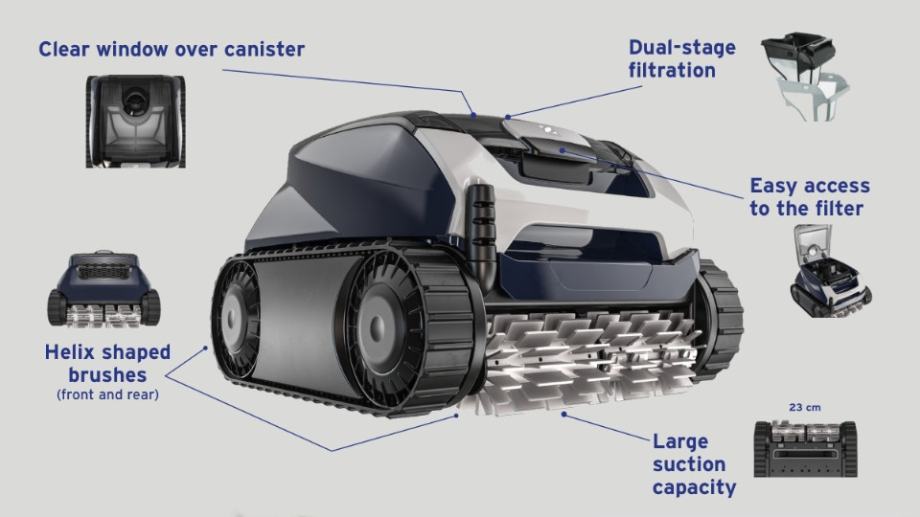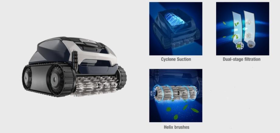 Zahvaljujući ugrađenim senzorima kao što su žiroskop ili akcelometar, robotski čistač nudi izvrsnu pokrivenost svakog bazena. Takošer dostupan daljinski putem iAqualink primjene. Njegove su spiralne četke, dvostruki kanister za filtriranje (60 i 150 mikrona), veliki usisni otvor od 23 cm omogućuju temeljito čišćenje svih dijelova bazena.