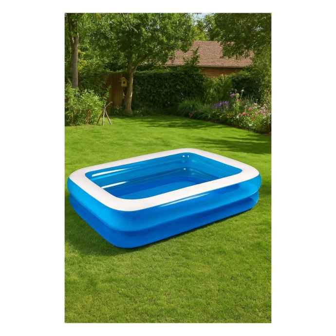 Ovaj jumbo obiteljski bazen na napuhavanje odličan je za za cijelu obitelj tijekom vrućih ljetnih dana. Bazen je četvrtastog oblika, u dvokomornoj izvedbi, s čvrstim bočnim stranicama. I-beam konstrukcija osigurava stabilnost. S zapreminom od 440 litara pruža dovoljno prostora za opuštanje odraslih, a djeci brčkanje i veselu igru u vodi.
