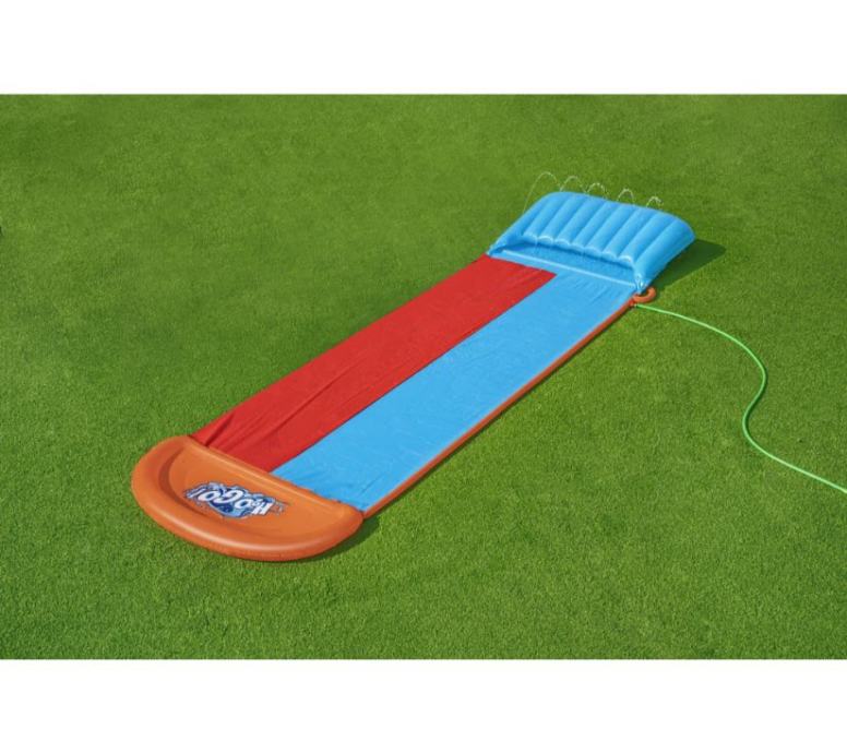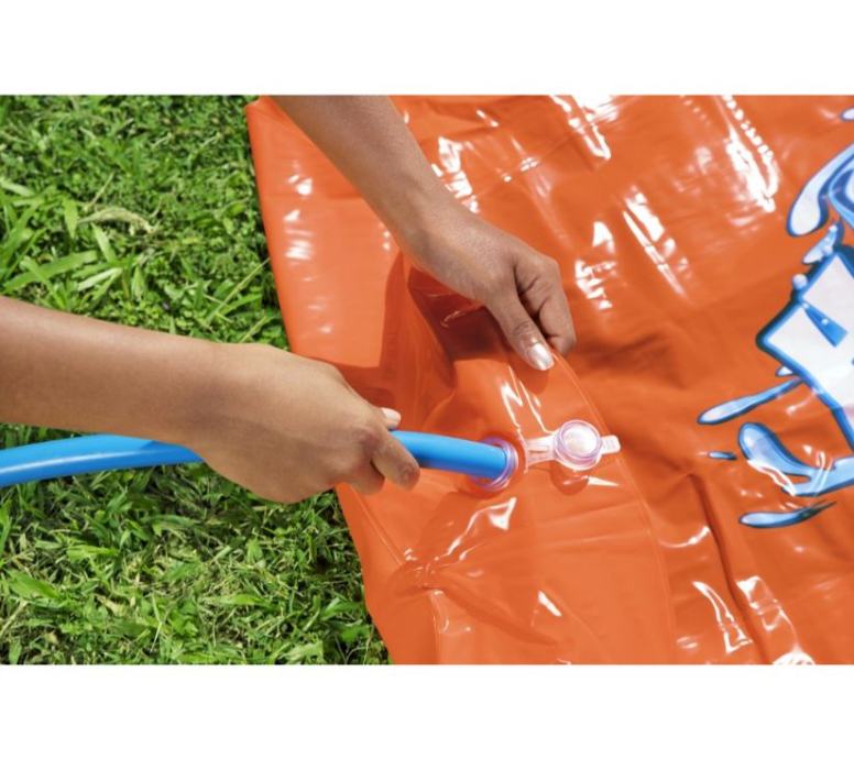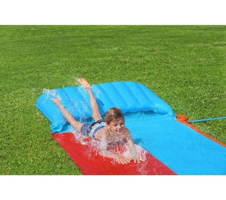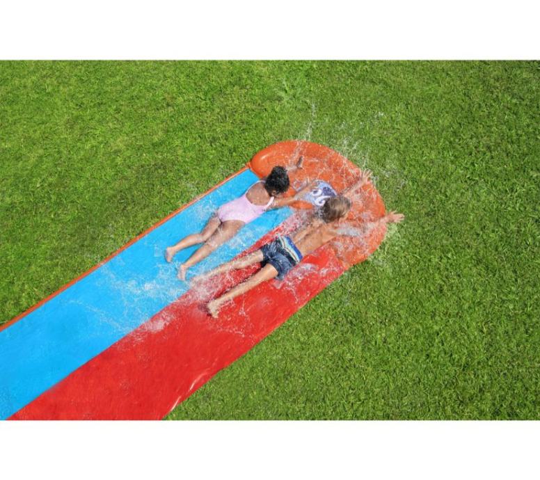 Dvostruki tobogan pružit će klasičnu, bezvremensku zabavu u dvorištima za svu djecu stariju od 3 godine. Bit će to idealan oblik provođenja slobodnog vremena i zanimljiva zabava. Jednostavno rasklopite tobogan, pričvrstite ga na tlo i spojite vrtno crijevo. Zahvaljujući posebnim zaštitama uključenim u set, tobogan se neće pomicati. Tobogan od 4,88 m savršen je za usamljene brzinske probe ili izmjenjivanje s prijateljima. Ugrađene prskalice posebno su dizajnirane da učinkovitije pokrivaju i pružaju kaskadni učinak, održavajući stazu skliskom.