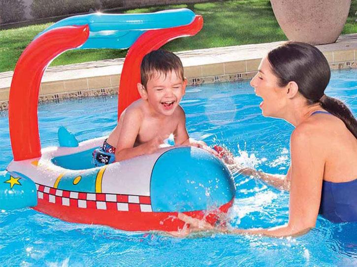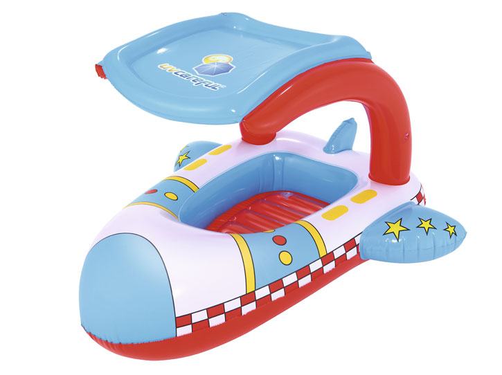 Dječji brodić na napuhavanje u obliku aviona s krovom koji štiti dijete od štetnih zraka sunca.