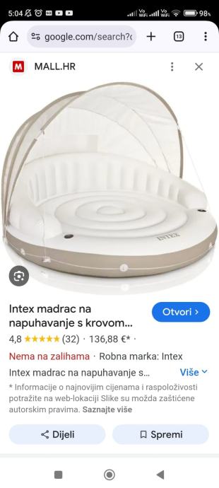 Prodajem Intex luftić s pokrvom, sve je ispravno i u odličnom stanju. Ima transport torbu za pohranu luftića. Cijena 60 eura